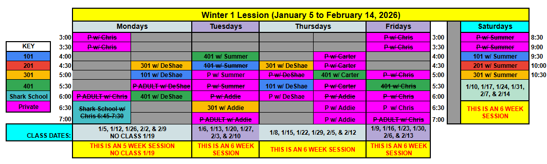 The charts below were last updated on 01/05/2026. If the class has a strike through it, that option has already been filled and is no longer available. Group classes that do not fill may be converted to another level or into private lessons. Email [email protected] to be on a waitlist.
